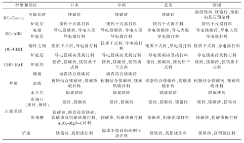 摘 要:由三根電極的普通交流電弧爐發(fā)展為超高功率(UHP)及一根電極的直流(DC)電弧爐,爐體結(jié)構(gòu)有一些改變。針對(duì)各部位的損毀因素,內(nèi)襯用的耐火材料也有所發(fā)展。例如普通電弧爐的爐頂用高鋁磚、爐墻鎂磚砌筑,而UHP及DC電弧爐采用大面積水冷爐頂、爐墻,爐頂三角區(qū)采用剛玉澆注料或預(yù)制件,爐墻用鎂碳磚,蝕損嚴(yán)重部位采用噴補(bǔ)作業(yè)。還介紹了日本等一些國(guó)家DC和UHP的各種爐型用耐火材料。煉鋼電弧爐是以電極端部和爐料之間發(fā)生的電弧為熱能進(jìn)行煉鋼的設(shè)備。電弧爐以廢鋼為爐料直接煉鋼,與礦石煉鐵后再煉鋼相比,基建投資少,節(jié)能60%、節(jié)水40%、減少?gòu)U氣排放86%、減少?gòu)U渣97%[1]。交流電弧爐歷史悠久,交流電是通過(guò)三根石墨電極輸入爐內(nèi),在電極下端與金屬料之間產(chǎn)生電弧,利用電弧高溫直接加熱爐料,使煉鋼過(guò)程得以進(jìn)行。供電功率越高,爐料熔化速度越快,降低能量消耗越多,因此出現(xiàn)超高功率(UHP)電弧爐。在超高功率的基礎(chǔ)上發(fā)展了直流(DC)電弧爐煉鋼。直流電弧爐是以一根石墨電極的端點(diǎn)為陰極,爐底為陽(yáng)極,石墨電極位于爐膛中心部位。與UHP相比設(shè)備結(jié)構(gòu)簡(jiǎn)單,建設(shè)費(fèi)用低,熔池中的電流與熱量分布比較均勻,不存在過(guò)熱區(qū)域,因此耐火材料損耗比較小、節(jié)能且噪音小等。目前,煉鋼電弧爐向大型化、控制自動(dòng)化方向發(fā)展。我國(guó)的電弧爐主要用來(lái)生產(chǎn)合金鋼。煉鋼水平與工業(yè)發(fā)達(dá)國(guó)家相比差距較大,如2015年我國(guó)電爐鋼占粗鋼總產(chǎn)量的6.1%,2020年有所提高,但也不超過(guò)10%,與世界平均水平的30%相比還有較大差距。我國(guó)已經(jīng)引進(jìn)先進(jìn)水平的UHP和DC電弧爐,隨著經(jīng)濟(jì)發(fā)展,工業(yè)化程度提高,必然伴以廢鋼資源數(shù)量增加,同時(shí)發(fā)展鐵礦石直接還原煉鐵技術(shù),代替廢鋼,增加電弧爐煉鋼的爐料,還有核電的發(fā)展,使電弧爐煉鋼有了物質(zhì)保證。電弧爐的內(nèi)襯是耐火材料構(gòu)成的,隨著UHP和DC技術(shù)的發(fā)展,需要新型優(yōu)質(zhì)耐火材料與之相配套。有人說(shuō)[2]:沒(méi)有優(yōu)質(zhì)爐襯、爐底耐火材料支持長(zhǎng)壽爐齡,超高功率電弧爐就無(wú)法發(fā)揮高效生產(chǎn)的優(yōu)勢(shì)。爐底耐火材料是直流電弧爐得以實(shí)現(xiàn)的必要條件,反映了煉鋼與耐火材料技術(shù)的互相影響,互為依存,在電弧爐煉鋼系統(tǒng)優(yōu)化生產(chǎn)中有不可分割的作用。1 電弧爐的結(jié)構(gòu)變化傳統(tǒng)的電弧爐由爐頂(又稱爐蓋)、爐墻、爐坡、爐底和出鋼槽構(gòu)成,全部用耐火材料構(gòu)筑,外包鋼制爐殼。爐墻一側(cè)設(shè)有爐門(mén),另一側(cè)為出鋼口,并與出鋼槽相連。而UHP和DC電弧爐采用偏心爐底出鋼,使?fàn)t體由傾動(dòng)式改為固定式,爐底有供氣攪拌設(shè)置,爐頂安裝氧-燃料燒嘴,在爐底偏心位置設(shè)置出鋼口,代替出鋼槽。由于取消了傾動(dòng)設(shè)備,擴(kuò)大了水冷面積,緩和了爐襯的損毀,適當(dāng)降低了出鋼溫度,并縮短了出鋼時(shí)間,從而降低生產(chǎn)成本。爐墻采用鑲砌水冷箱式水冷套措施,其內(nèi)表面噴涂一層耐火涂料,使其掛渣形成保護(hù)層,可有效降低耐火材料消耗,但電耗可能增加。國(guó)外有的電弧爐功率達(dá)1 000 kV·A/t以上,爐墻壽命達(dá)2 000爐次以上,水冷爐蓋壽命達(dá)4 000爐次,降低耐火材料消耗60%以上。2 耐火材料內(nèi)襯的損毀因素電弧爐內(nèi)襯的耐火材料長(zhǎng)期處于高溫、熔渣侵蝕和急熱急冷狀態(tài)下,工作條件極其惡劣。在煉鋼的熔化期和氧化期,不致于因高溫?fù)p壞爐襯,但在還原期的鋼液溫度相當(dāng)高,又受電弧直接輻射(有時(shí)溫度達(dá)4 000℃以上),爐襯很容易造成熔融損壞。出完鋼裝料時(shí),爐襯溫度突然下降,裝完料開(kāi)始送電,溫度又逐漸升高,這種急冷急熱是爐襯剝落的直接原因,主要是爐頂容易剝落。耐火材料內(nèi)襯損毀的主要因素包括[3]:(1)化學(xué)侵蝕。FeO或渣中SiO2與耐火材料中的CaO、MgO之間的化學(xué)反應(yīng),使?fàn)t襯變?yōu)槿墼鴮?dǎo)致?lián)p毀。(2)耐火材料內(nèi)襯中的碳成分被含氧成分(如FeO、O2、MgO等)氧化,導(dǎo)致耐火材料脫碳而損毀。(3)沖刷和機(jī)械沖擊。鋼水或熔渣流過(guò)耐火材料表面,以物理性磨損或沖刷爐襯,而導(dǎo)致內(nèi)襯損毀;在出鋼口、渣線、電極口或排氣口平臺(tái)等沖刷嚴(yán)重,廢鋼等爐料吊入往往撞擊爐襯而損毀。(4)水化。在生產(chǎn)過(guò)程中,往往會(huì)出現(xiàn)爐頂或爐墻漏水或滲水,還有水蒸氣,與堿性耐火材料中的MgO、CaO進(jìn)行水化反應(yīng),使內(nèi)襯損毀。3 電弧爐用耐火材料根據(jù)電弧爐的結(jié)構(gòu),由于各部位承受的熱負(fù)荷大小不同,與熔渣、鋼水接觸作用及機(jī)械損壞程度存在差異,不同部位必須采用不同的耐火材料[4]。3.1 爐頂(蓋)我國(guó)中小電弧爐普遍采用燒成或不燒高鋁磚,局部用高鋁質(zhì)或剛玉質(zhì)不定形耐火材料預(yù)制件。大型超高功率電弧爐和直流電弧爐采用水冷技術(shù),除三角區(qū)外,爐頂耐火材料不是關(guān)鍵。三角區(qū)由于強(qiáng)烈熱震及電極